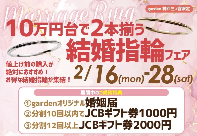 10万円で2本揃うのは今しか無い!結婚指輪フェア│2/16(月)~2/28(土)