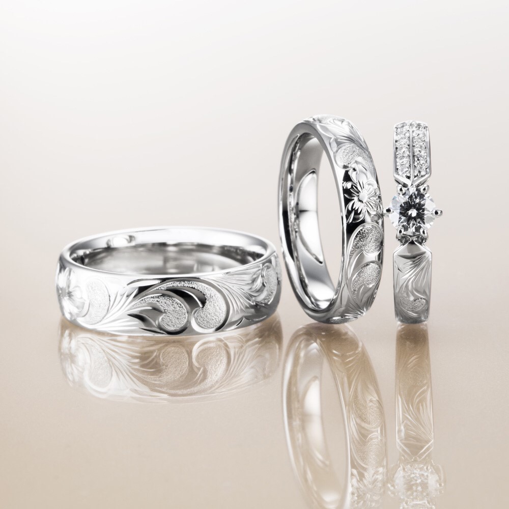 ハワイ独自の伝統的に育まれてきた模様が、手彫りによって彫り込まれた製品で、日本でゼロから作り上げたメイド・イン・ジャパンのマリッジリングです。日本で一般に流通している単なるインポートもののハワイアンジュエリーとは本質的に異なり、日本の高い鍛造の技術を持って作られたリングにハワイの伝統の美しいモチーフを手彫りで彫り上げたハイデザイン・ハイクオリティな新生ハワイアンジュエリーです。